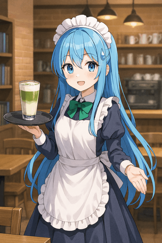白いフリルのエプロンに、深い藍色のドレス。 長い青髪をリボンでまとめ、胸元には翡翠色の蝶ネクタイ。 彼女の名は「綾瀬ユリ」。このカフェでは、そう名乗っている。