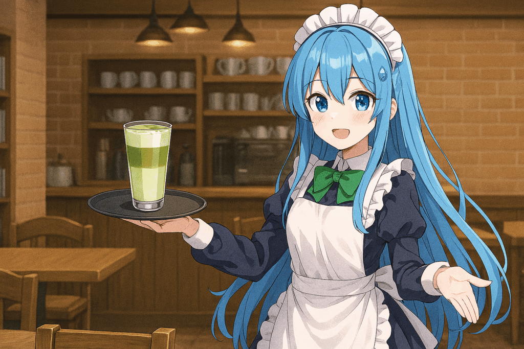 翡翠色のリボンが揺れ、白いエプロンが光を反射する。