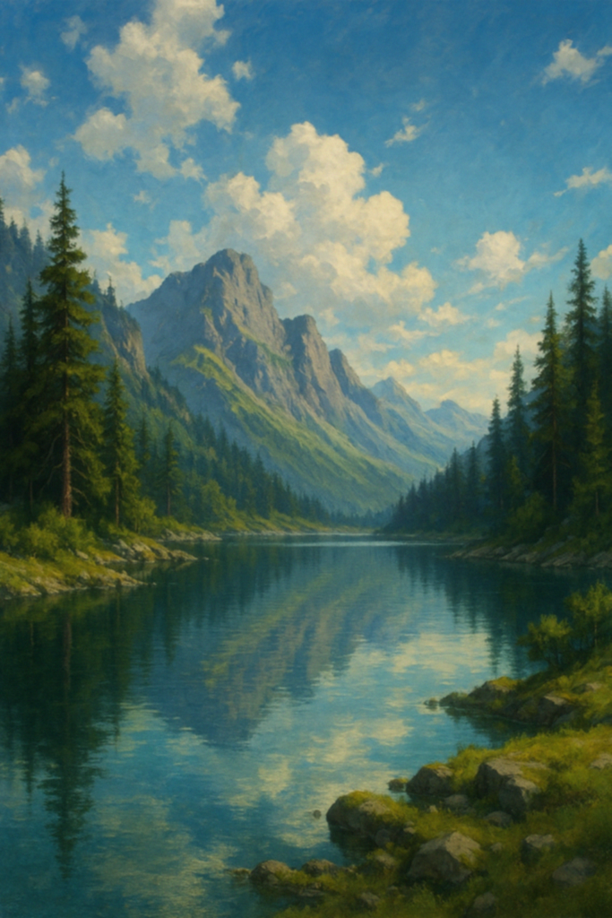 この絵を描くにあたって、特に力を入れたのは「静けさの表現」です。水面の反射、岩の質感、木々の密度、そして空の雲の柔らかさ。それぞれが調和し、見る者の心を穏やかにするように構成されています。色彩は自然光を意識し、朝の柔らかな光が差し込む瞬間を切り取っています。