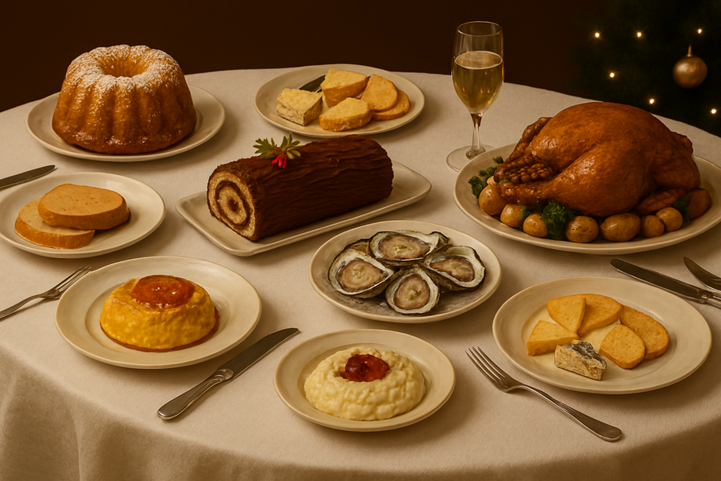 木のテーブルには、フォアグラ、牡蠣、七面鳥のロースト、