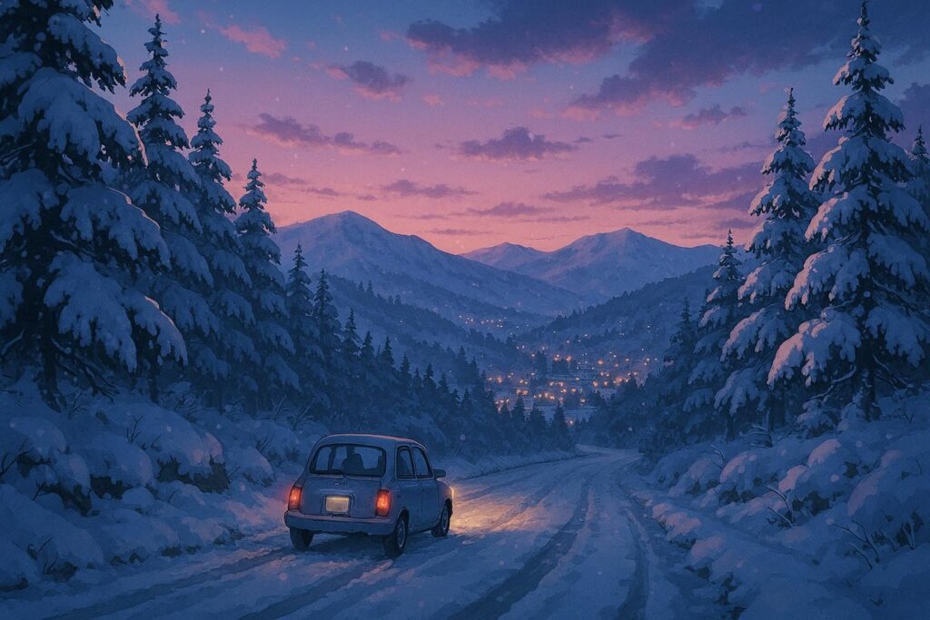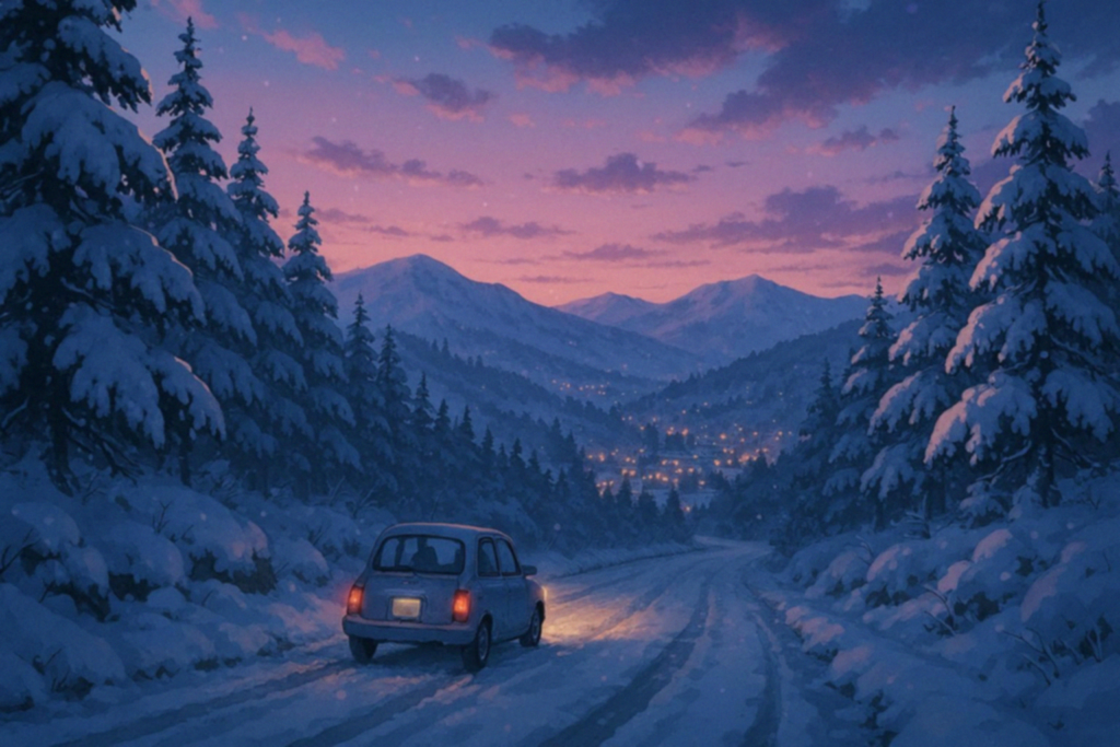 雪に覆われた山道を、車が一台、静かに走っていく。