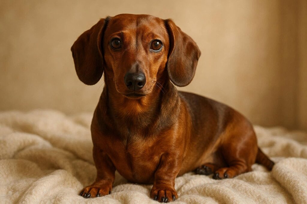 背景には自然光が差し込み、ダックスフンドの毛並みが柔らかく輝いています。リアルな質感と温かみのある色合いが、まるで本物の写真のような印象を与えてくれます。